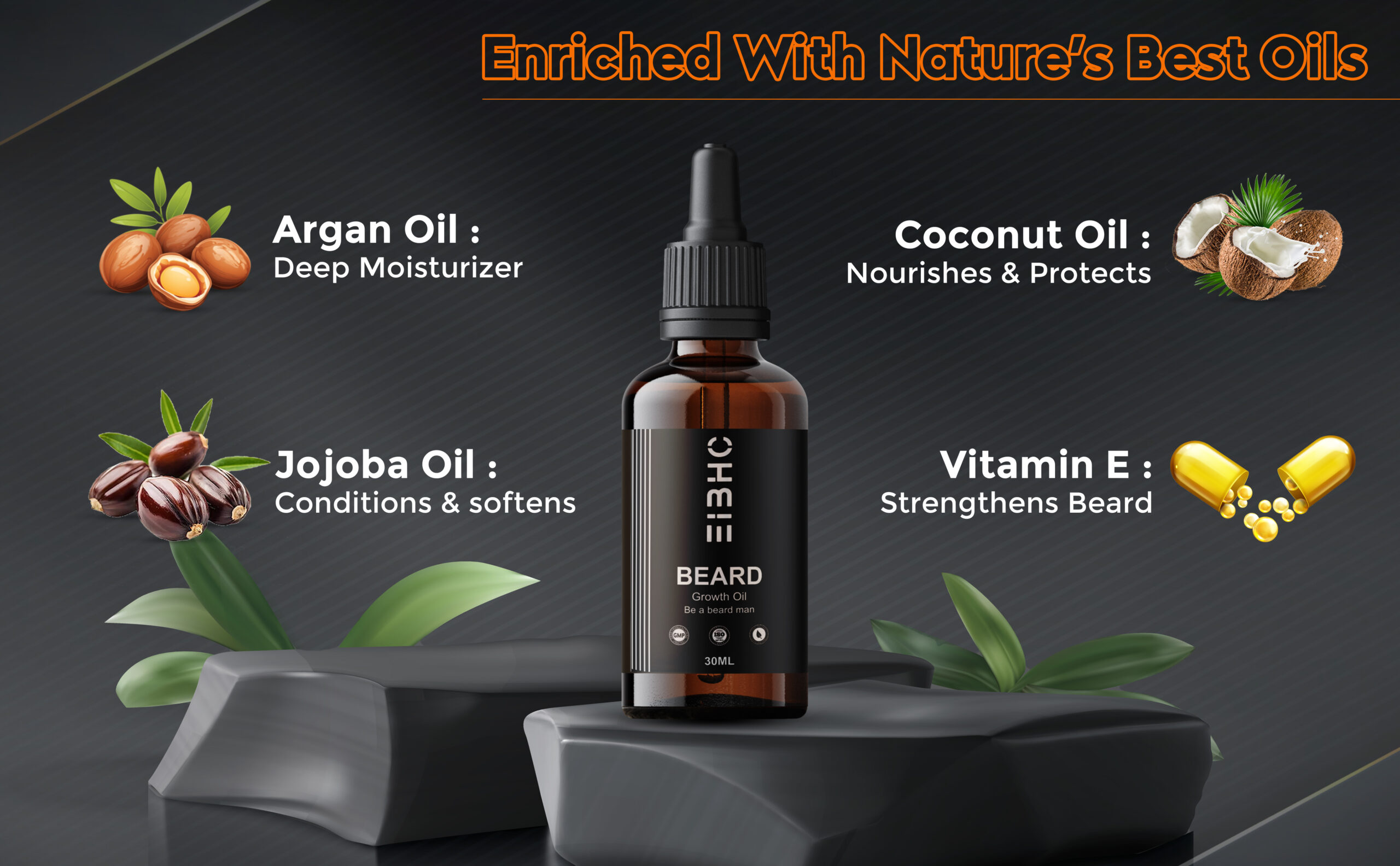 EIBHC Natural Beard Growth Oil for Men 30 ml | Herbal & Ayurvedic Formula with Castor, Jojoba & Argan Oil | Helps Thicker, Fuller & Patchy Beard | Non-Sticky Beard Care Oil