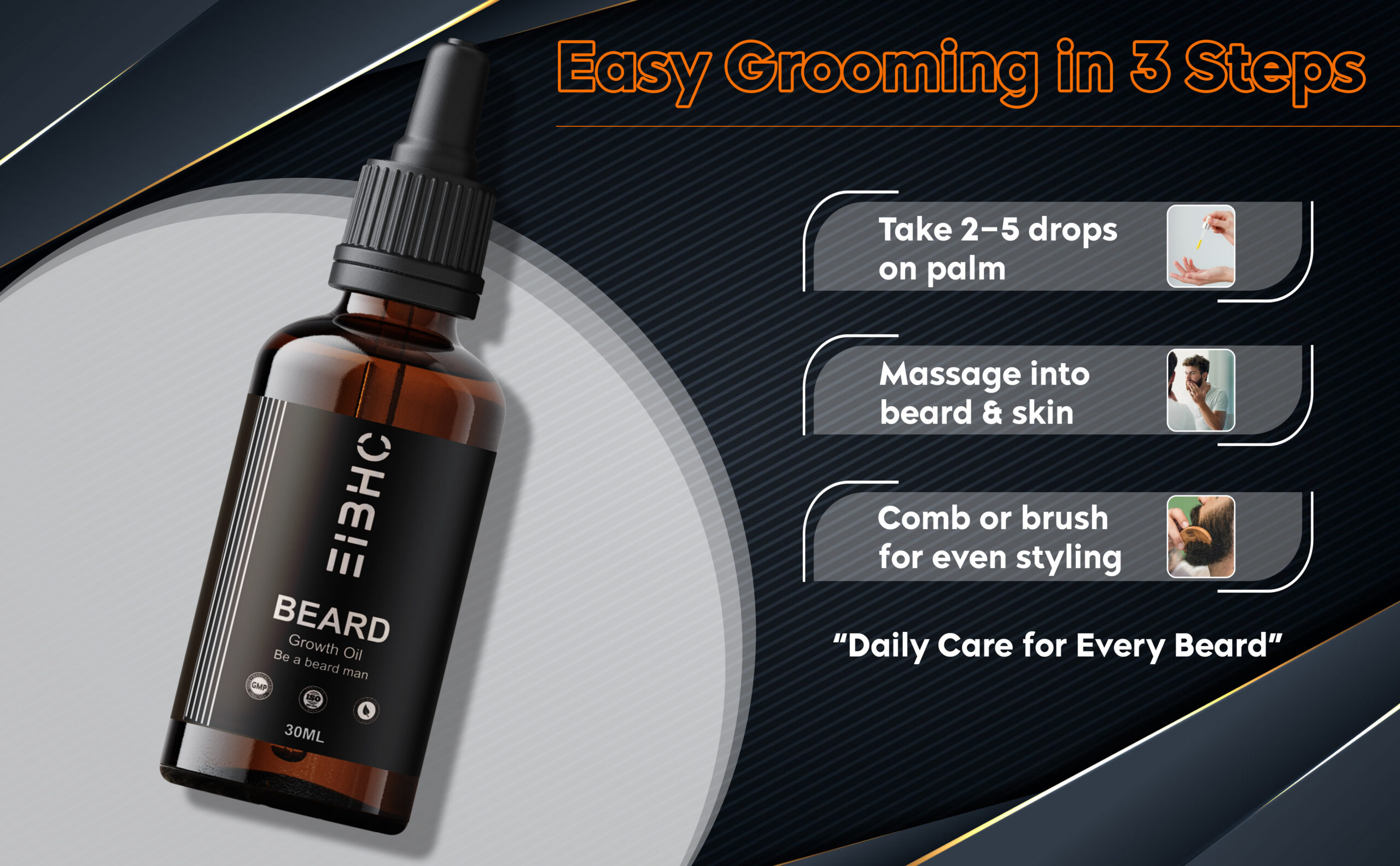 The carefully selected natural carrier oils such as castor oil, jojoba oil, argan oil, and coconut oil deeply moisturize beard hair, strengthen roots, and help reduce dryness, itchiness, and beard dandruff. Essential oils like rosemary and peppermint support healthy circulation to the skin, which is essential for maintaining strong and healthy beard hair. Regular use helps soften coarse beard hair, making it easier to manage and style.