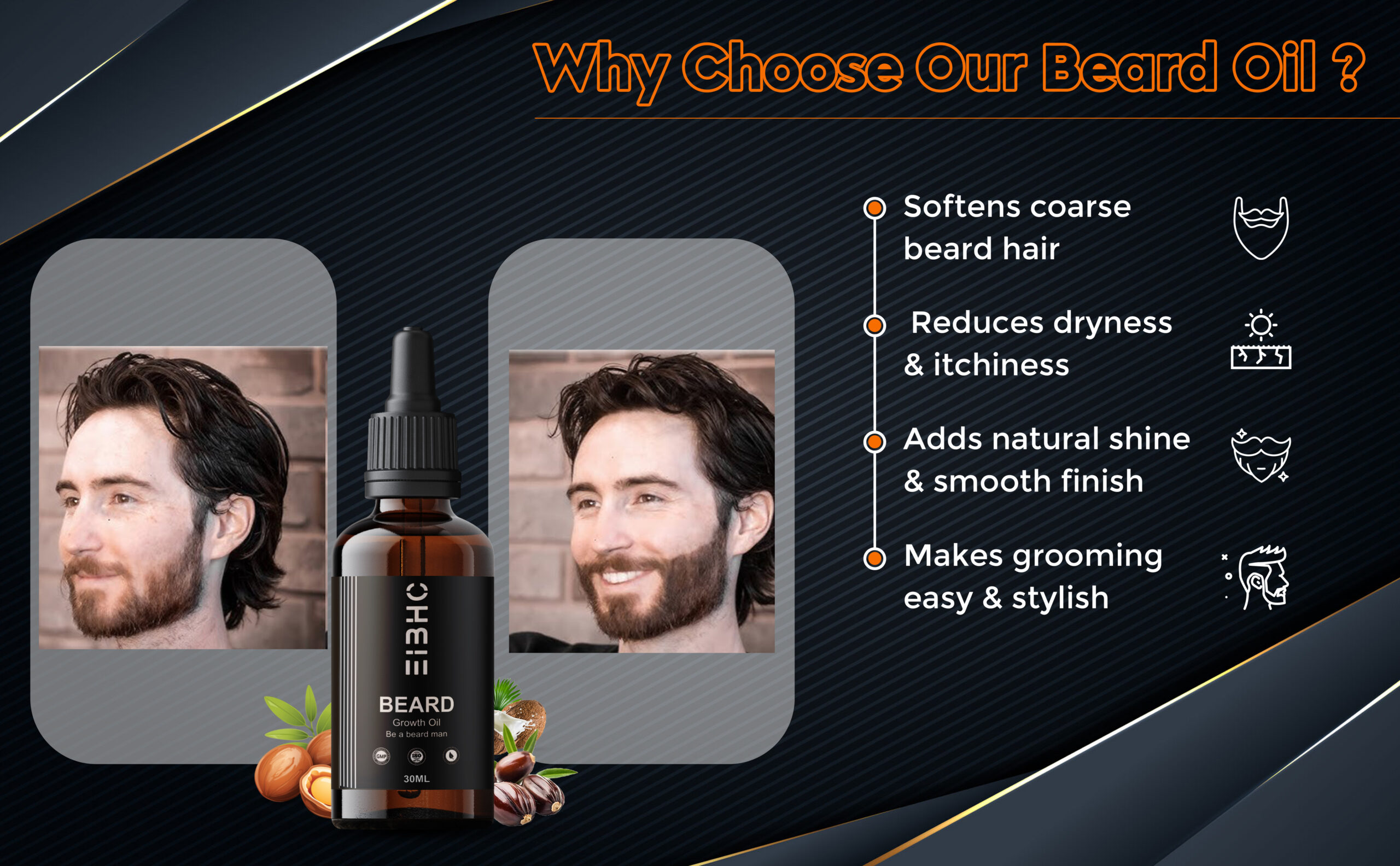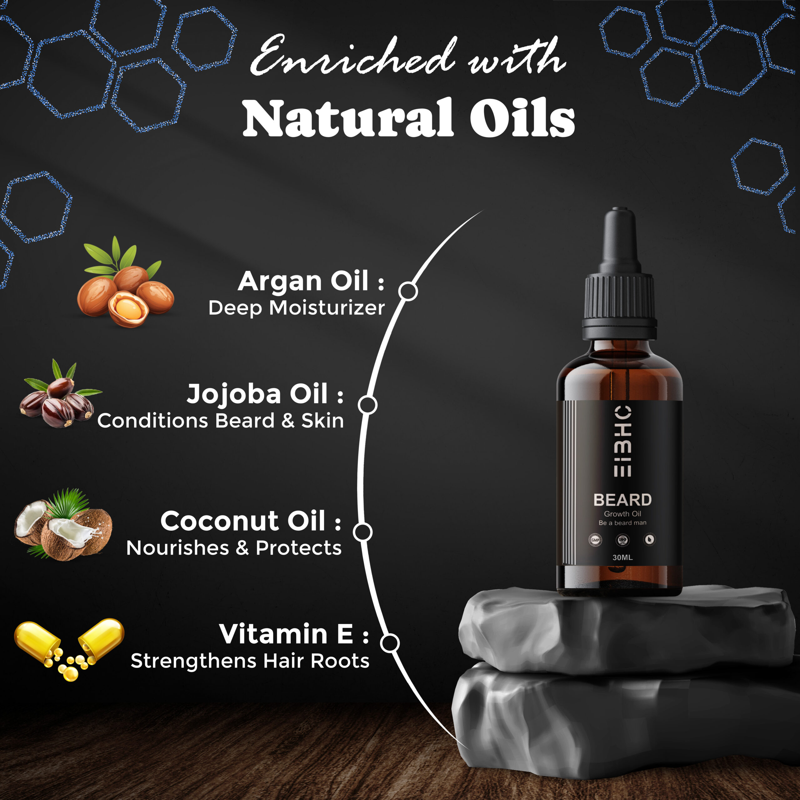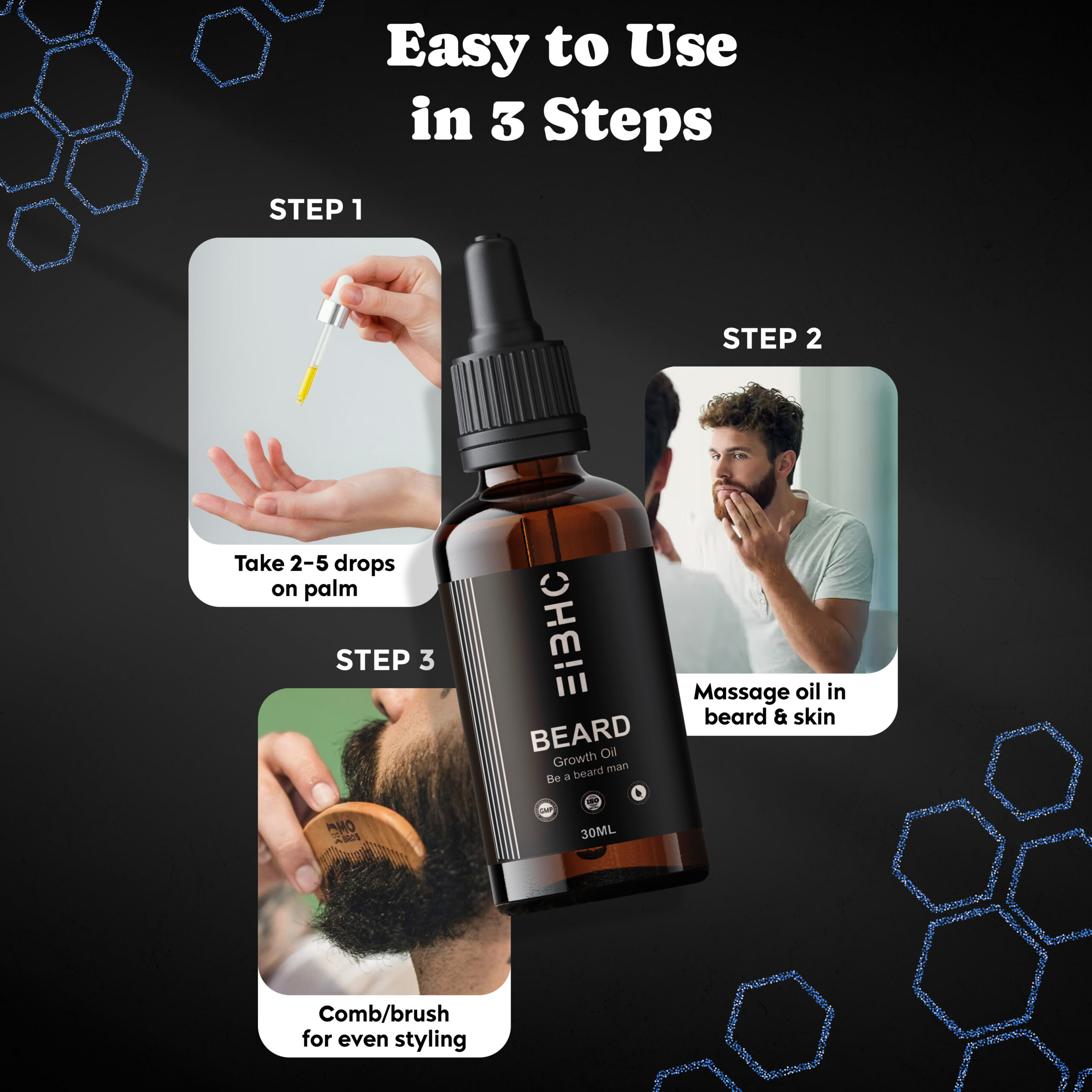 The carefully selected natural carrier oils such as castor oil, jojoba oil, argan oil, and coconut oil deeply moisturize beard hair, strengthen roots, and help reduce dryness, itchiness, and beard dandruff. Essential oils like rosemary and peppermint support healthy circulation to the skin, which is essential for maintaining strong and healthy beard hair. Regular use helps soften coarse beard hair, making it easier to manage and style.